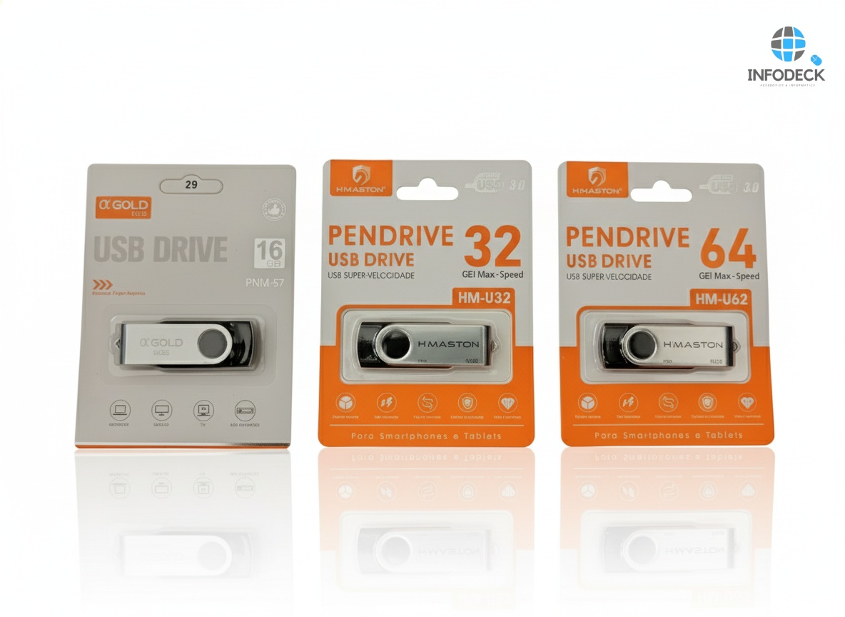 Compacto e durável, o pendrive αGold Plus e H’maston 16GB | 32GB | 64GB é ideal para armazenar e transportar arquivos, fotos e músicas com segurança. Design giratório metálico e alta compatibilidade.